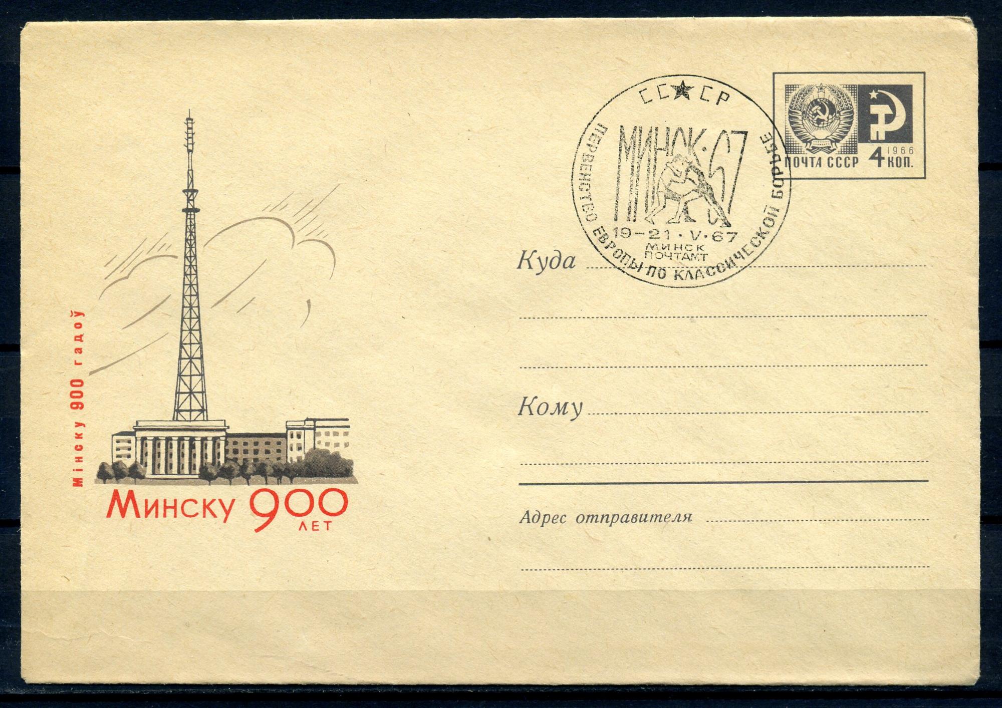 Почтовый конверт ХМК со СГ. СССР 1967 г. 900 лет Минску. СГ - первенство Европы по классической борьбе. КО.