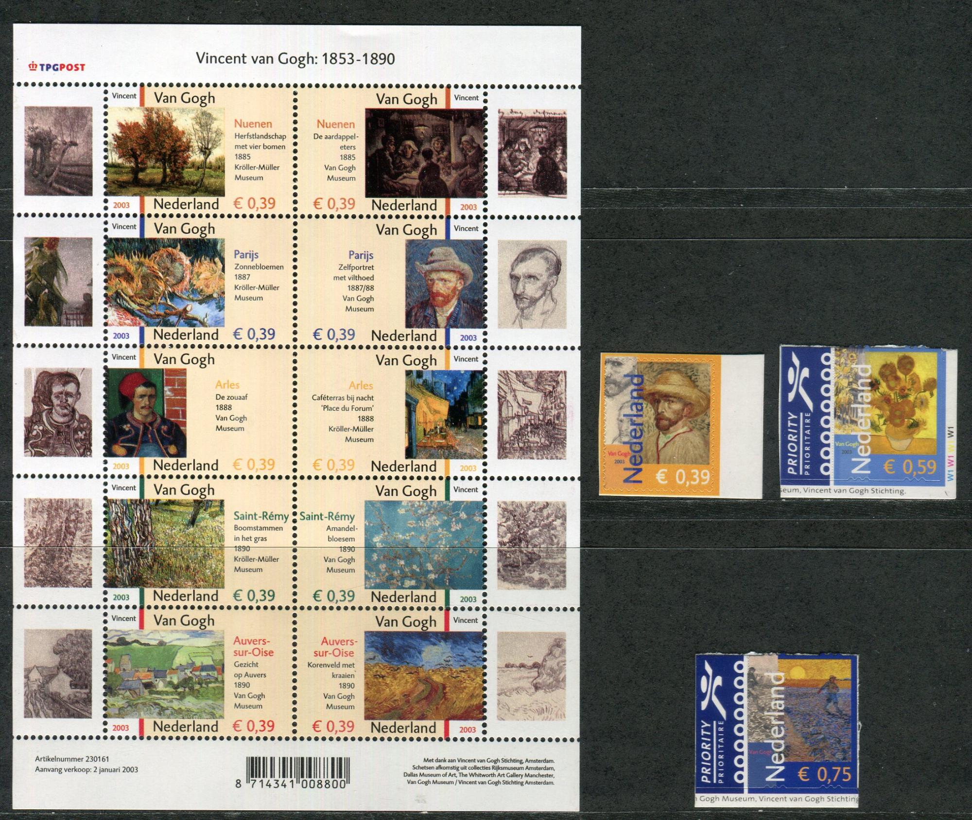 Почтовые марки. Нидерланды, 2003 г. 150 лет со дня рождения Винсента ван Гога. MiNr. 2073 - 2082 МЛ, 2083 - 2085 (самоклеящиеся).
