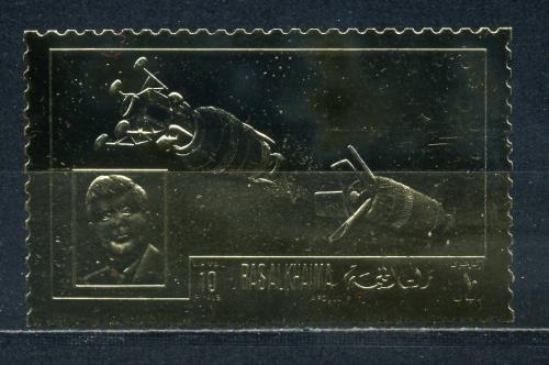 Почтовые марки. Рас-эль-Хайма. 1969г. Космос. Кеннеди. Аполло-10. Фольга. Золото. №685 (Mi: 11.00 Euro).