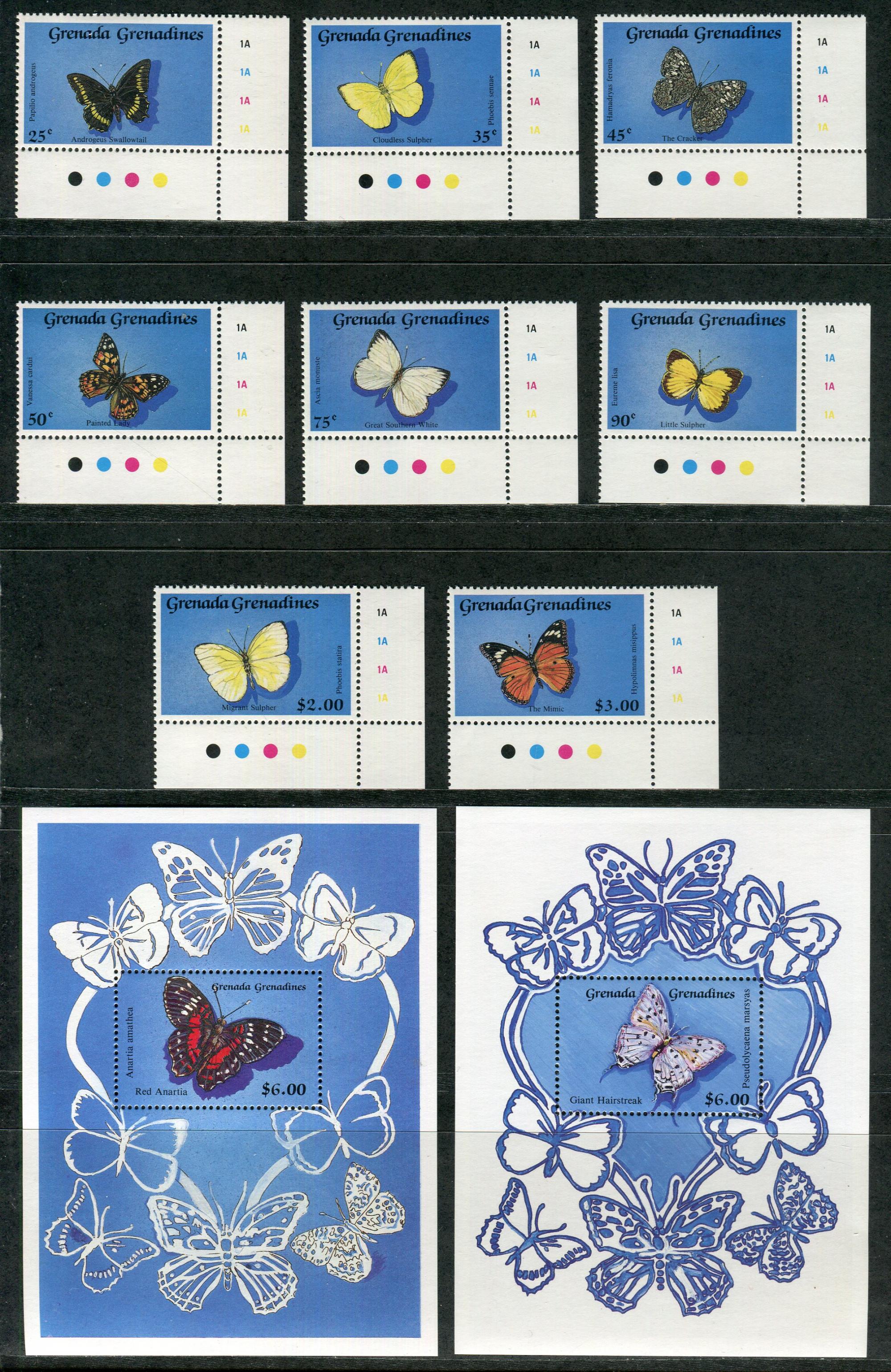 Почтовые марки. Гренада и Гренадины, 1989 г. Бабочки. Mi.No. 1201 - 1208, Бл. 176, 177. (Mi 27.00 €)