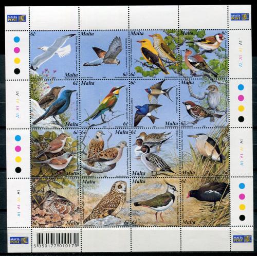Почтовые марки. Мальта, 2001 г. Местные птицы. Mi.No. 1172 - 1187 Лист.