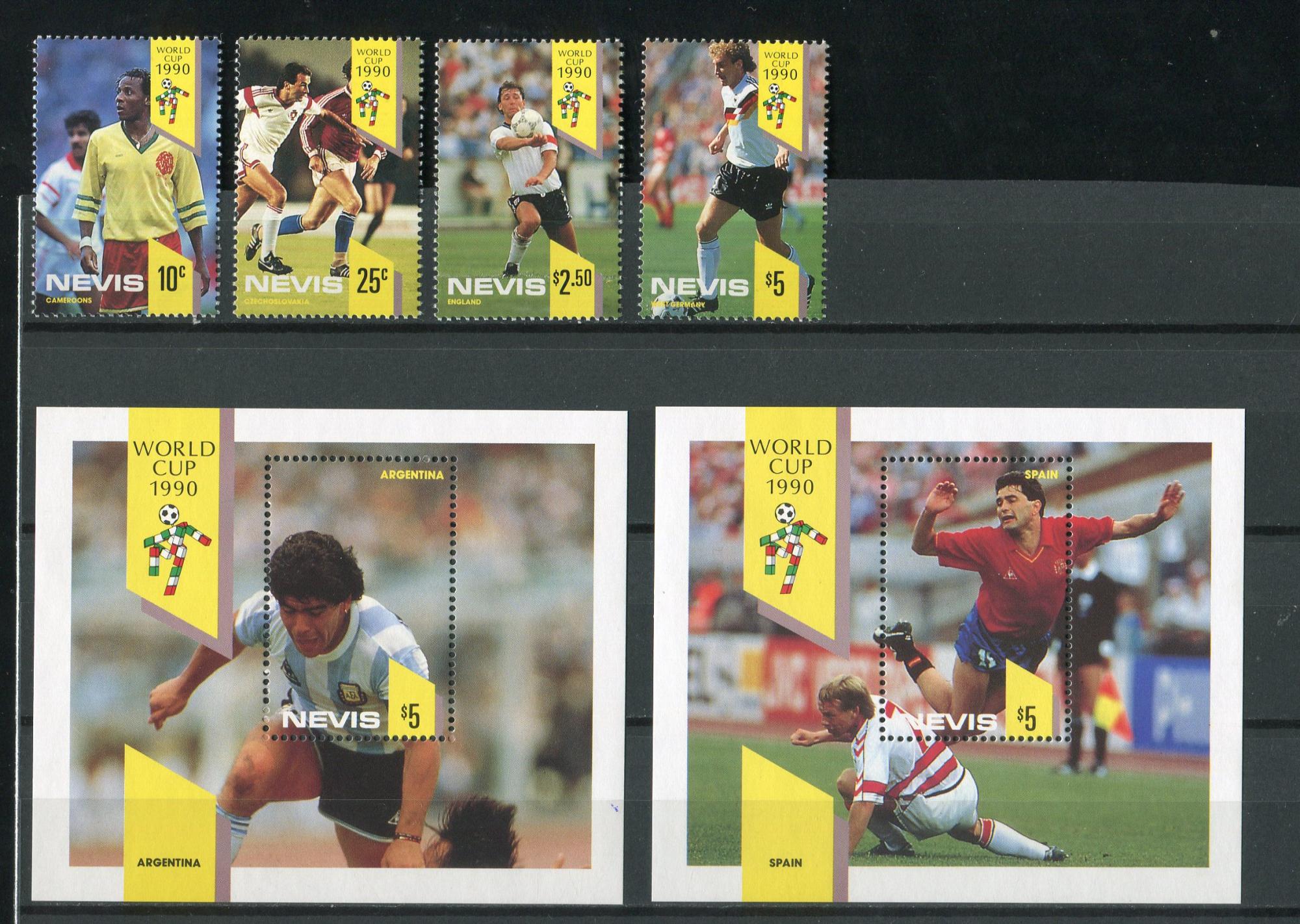 Почтовые марки. Невис, 1990 г.Чемпионат мира по футболу, Италия. Mi.No. 552 - 555, Бл. №27,28. (Mi 17.50€)