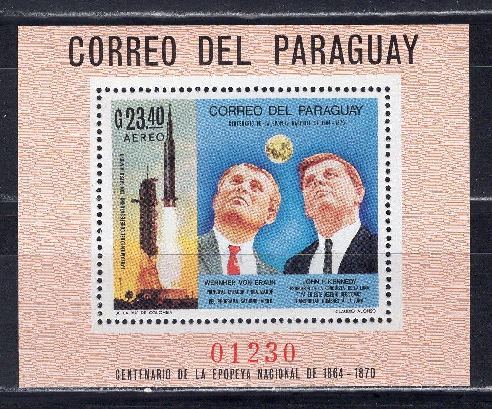 Почтовые марки. Парагвай. 1969г. Космос. Кеннеди и Вернер фон Браун. Блок №124 (Mi: 20.00 Евро)