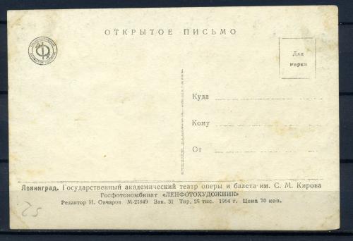 Открытое письмо. СССР 1950-е гг. Ленинград. Театр оперы и балета им. Кирова.