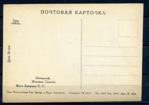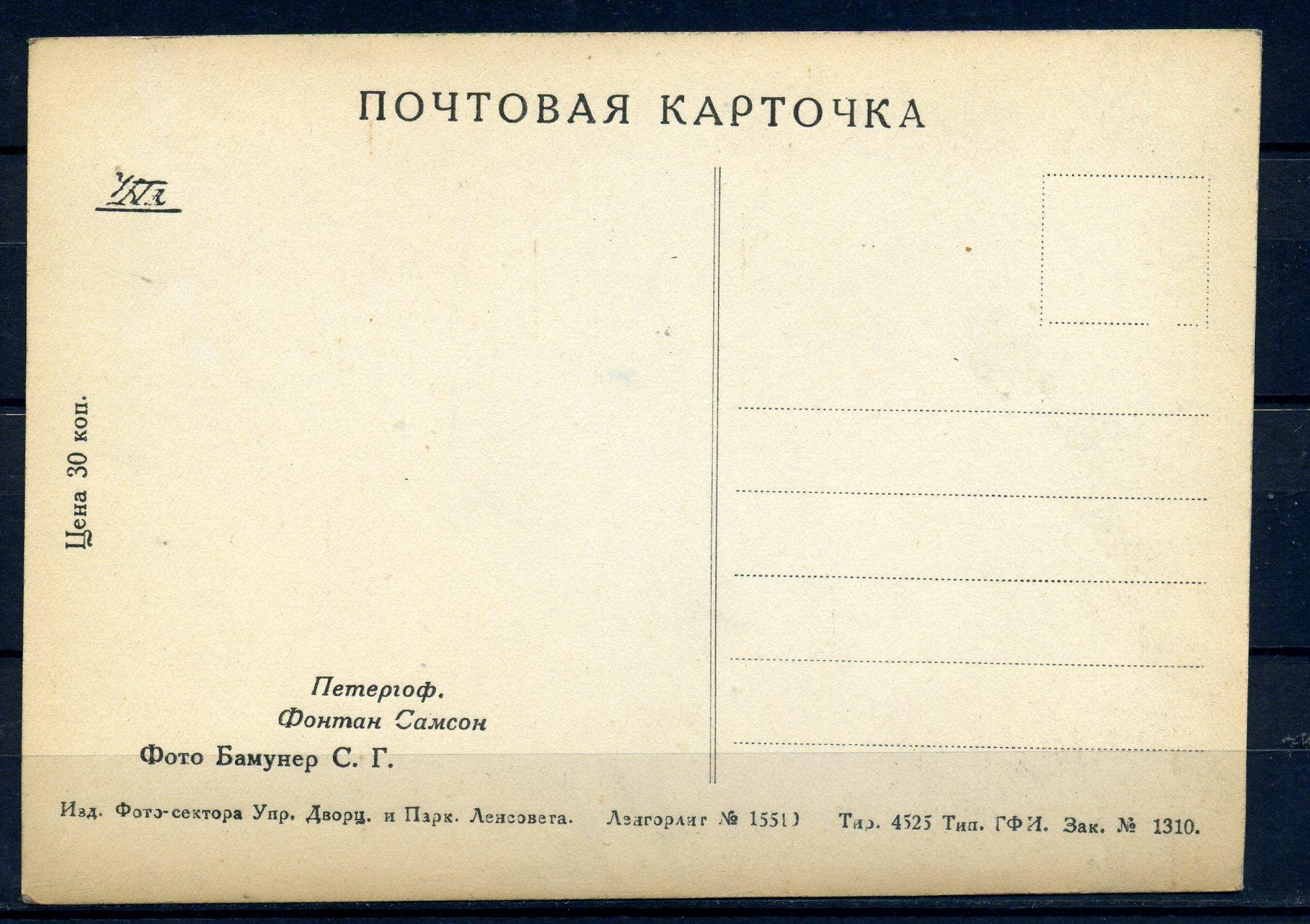 Почтовая карточка. СССР 1950-е гг. Петергоф. Фонтан Самсон.