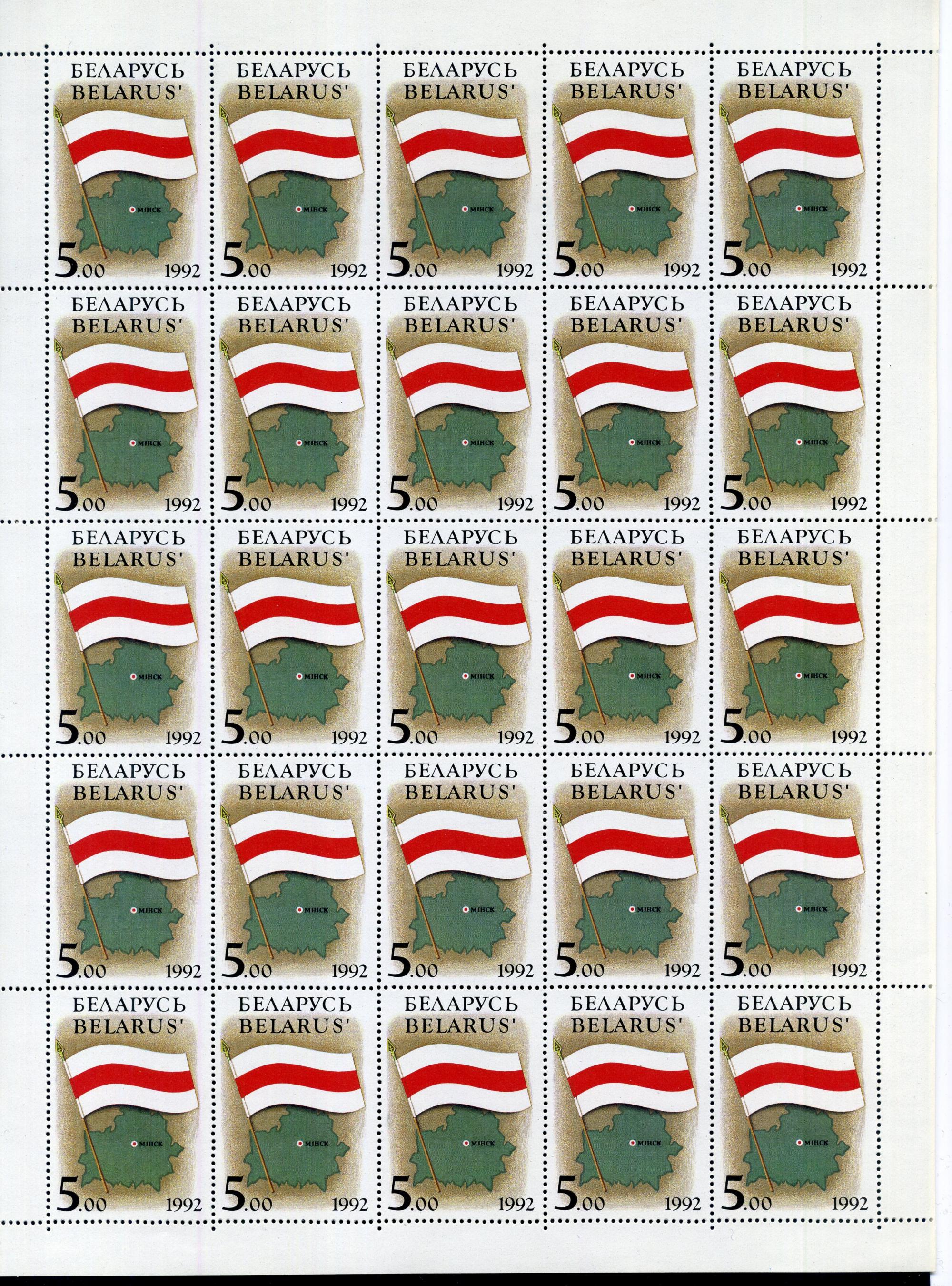 Почтовые марки. Беларусь. 1992г. Национальные символы. Флаг. №4. Лист.