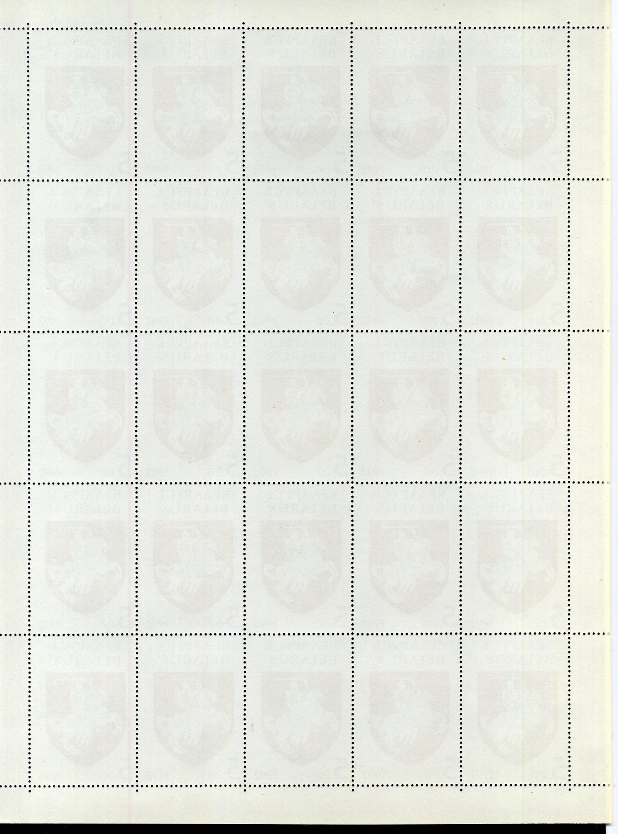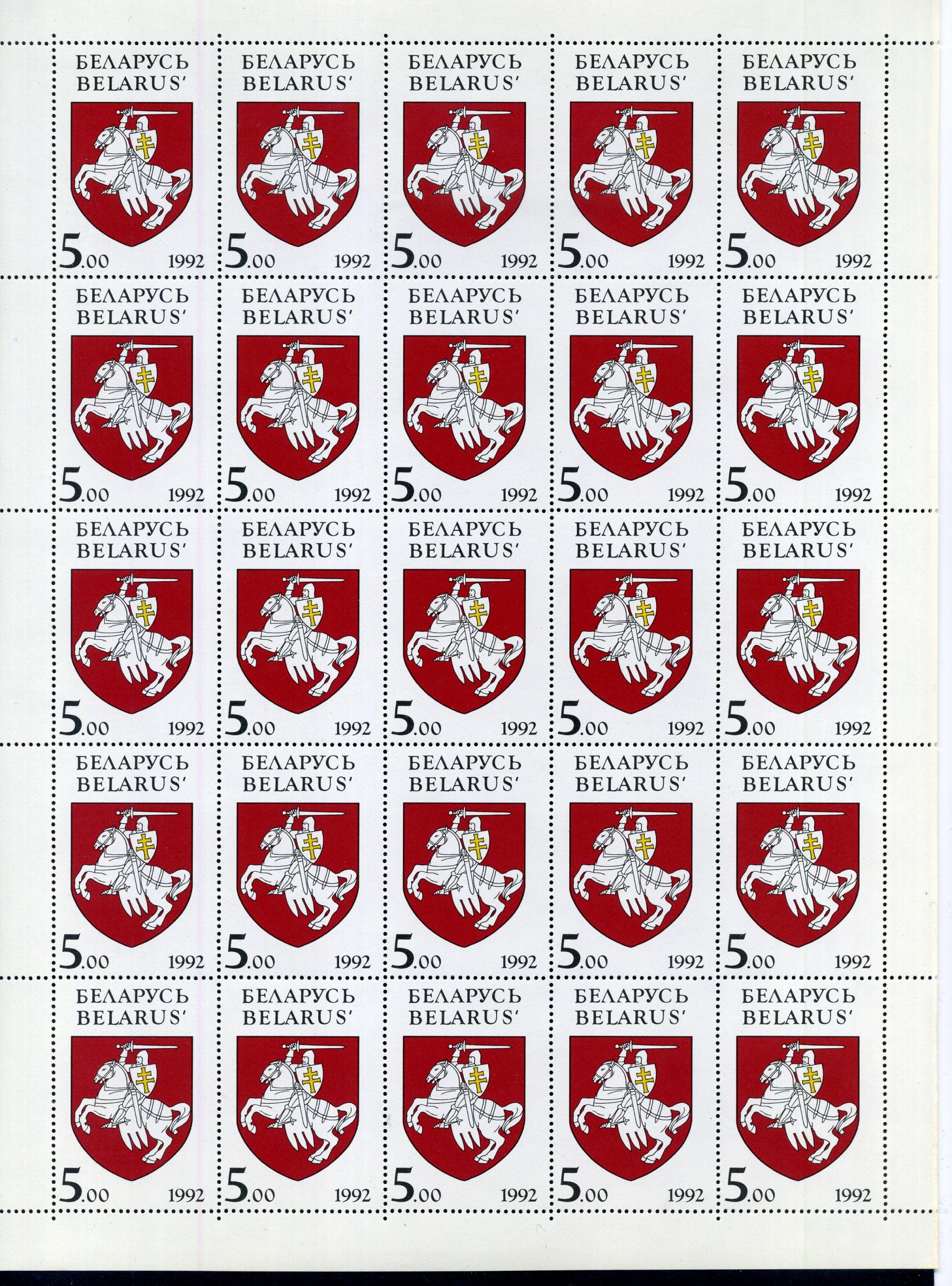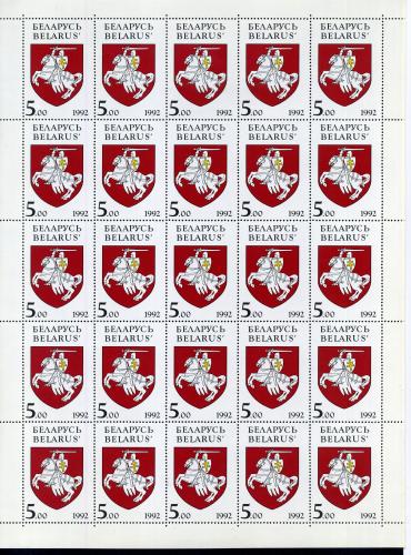 Почтовые марки. Беларусь. 1992г. Национальные символы. Герб. №5. Лист.