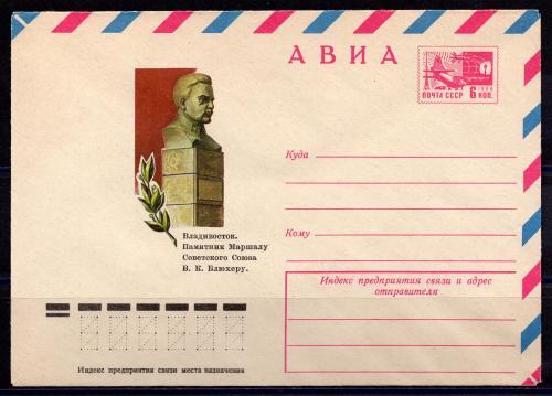 Почтовый конверт ХМК. СССР. 1975 г. Владивосток. Памятник Маршалу В.К.Блюхеру. КО.