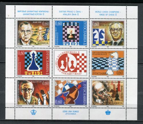 Почтовые марки. Югославия, 1995 г. №2723-30 МЛ. Шахматы. Чемпионы мира.