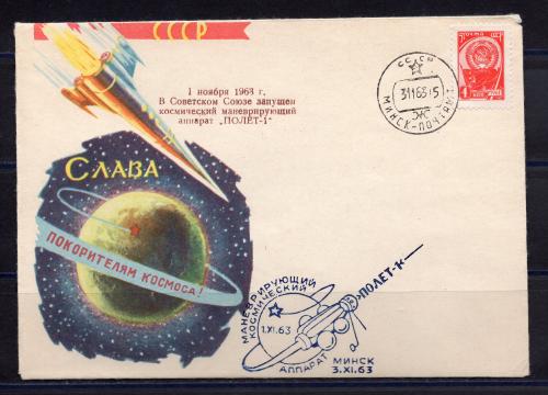 Почтовый конверт ХМК со СГ. СССР. 1963 г. Запуск космического маневрирующего аппарата "Полёт-1". КО.