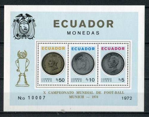 Почтовые марки. Эквадор, 1973 г. Бл.62. Футбол. Монеты.