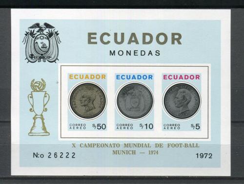 Почтовые марки. Эквадор, 1973 г. Бл.62 B. Футбол. Монеты.