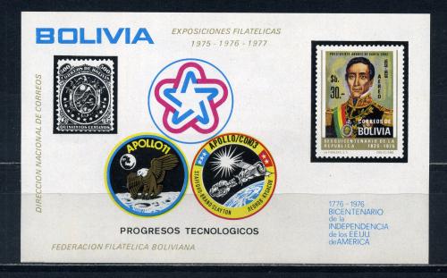 Почтовые марки. Боливия. 1975г. Филвыставка. Космос. Союз-Аполлон. Блок №60 (Mi: 32.00 Евро)