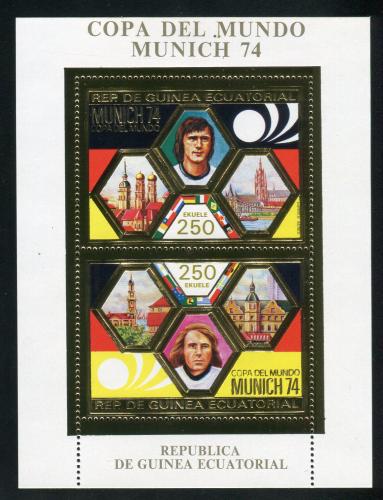 Почтовые марки. Экватор. Гвинея, 1974 г. Футбол. Бл. 119. Фольга, золото. Mi 17,00 €
