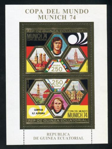 Почтовые марки. Экватор. Гвинея, 1974 г. Футбол. Бл. 125. Фольга, золото. Надпечатка. Mi 15,00 €