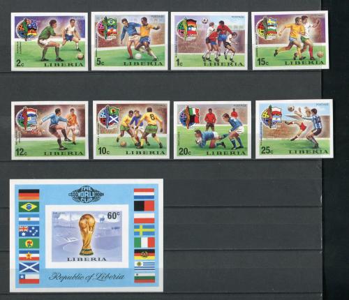 Почтовые марки. Либерия, 1974 г. №921-928 B. Бл. 72 B. Футбол. Беззуб. (Mi 40 €)
