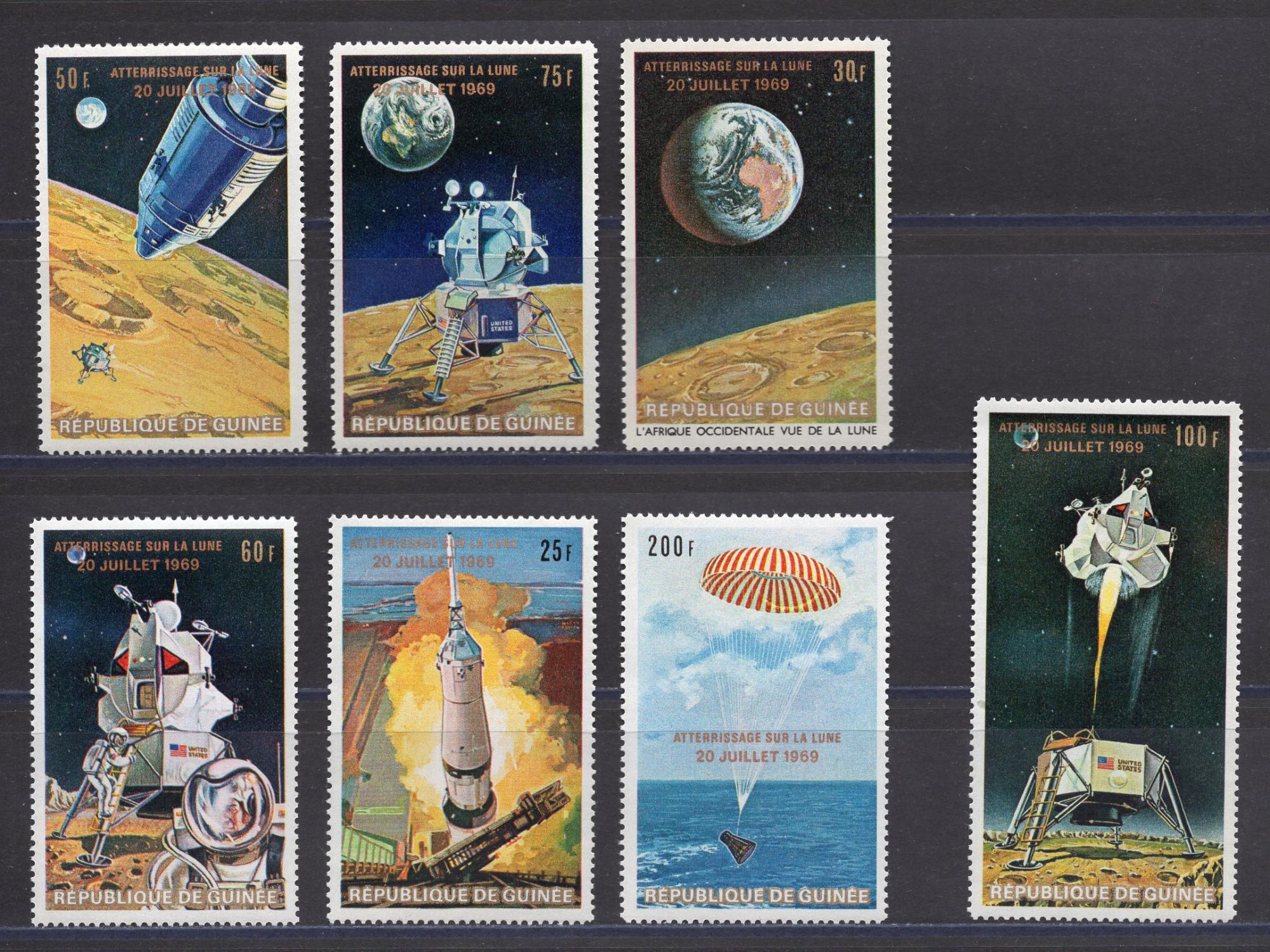 Почтовые марки. Гвинея. 1969г. Космос. Аполлон на Луне. Надпечатка Французская. №542II-548II.