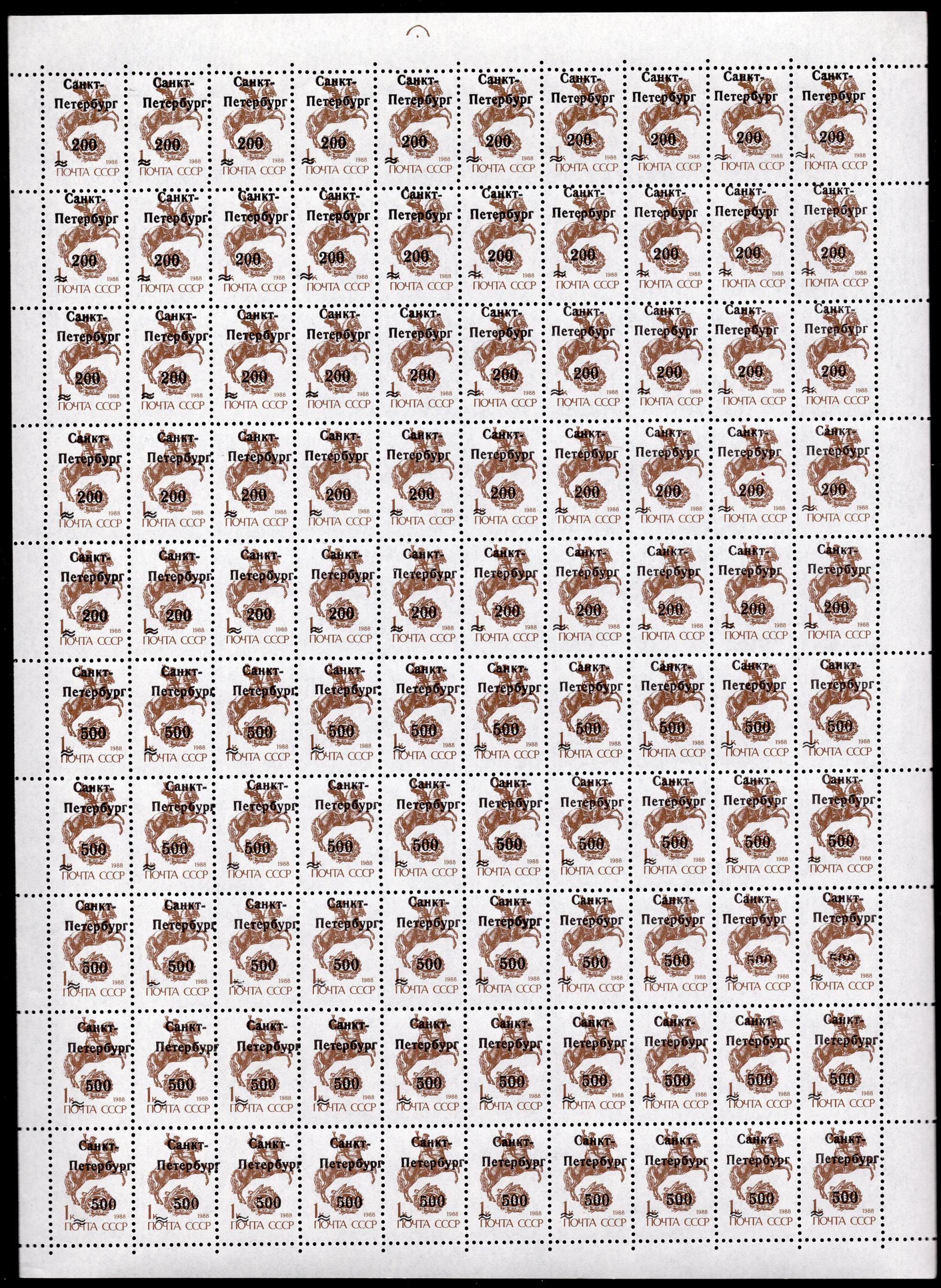 Почтовые марки. С-Петербург. Локальная почта. 1988. Cтандарт. Надпеч. (200 и 500) ЛИСТ. № L4+L5.