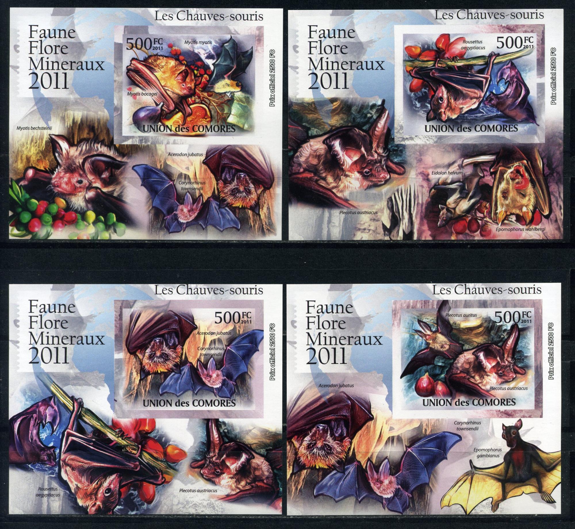 Почтовые марки. Коморы. 2011г. Летучие мыши. Люкс-блоки. №3053-3054.3056-3057. Беззубц.