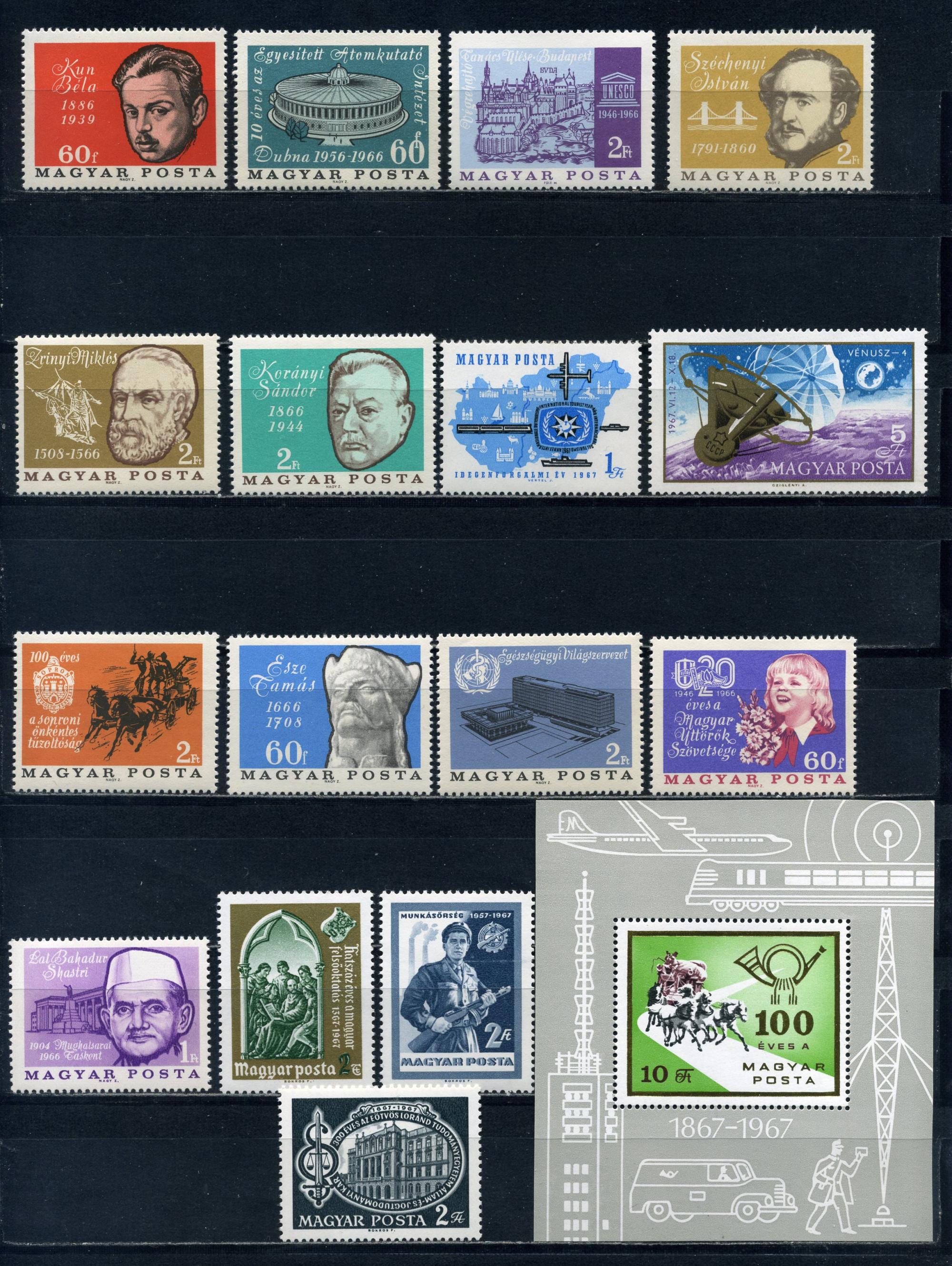 Почтовые марки. Венгрия. 1966-1967гг. Известные деятели. Транспорт и космос. Сб. лот. №2210 и т.д. Блок №60.