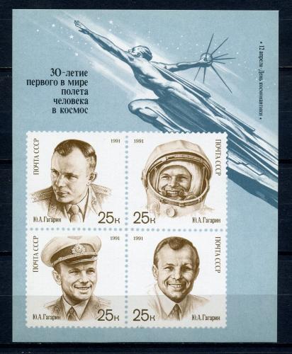 Почтовые марки. СССР 1991г. День космонавтики. Гагарин. №6310. БЛ