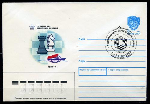 Почтовый конверт ХМК со СГ. СССР 1990г. 1-й ЧМ среди студентов по шахматам. Одесса. КО