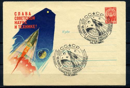 Почтовый конверт ХМК со СГ. СССР 1961г. Слава советской науке и технике.(кат.600р). СГ-Человек страны Советов в космосе. КО