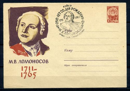 Почтовый конверт ХМК со СГ. СССР 1961г. 250 лет со ДР М.В.Ломоносова. (кат.600 р). КО.