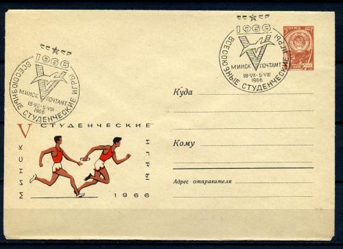 Почтовый конверт ХМК со СГ. СССР 1966 г. Всесоюзные студенческие игры. КО.