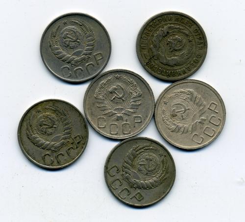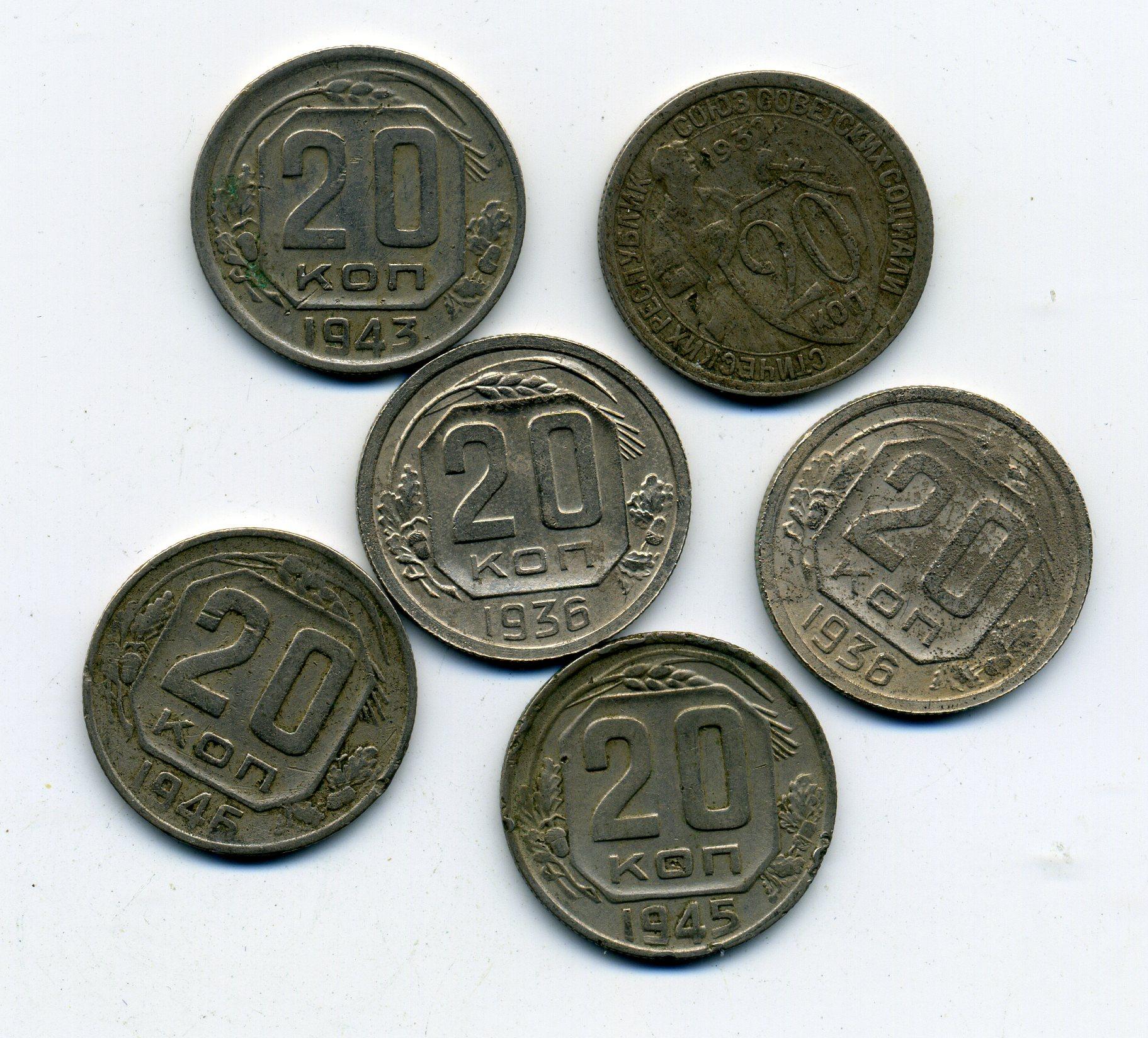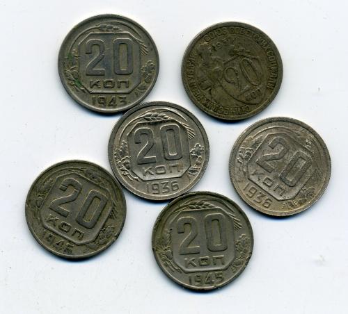 Монеты СССР. 20 копеек 1932-1945 г. 6 шт.