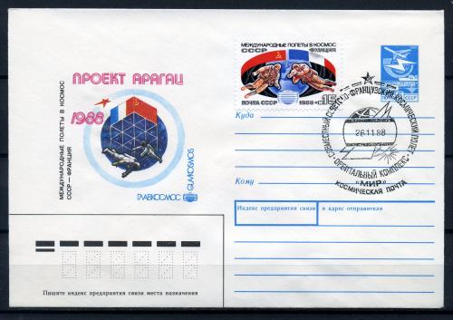 Почтовый конверт ХМК с маркой и СГ. СССР 1988г. Совместный Советско-Французский космический полет. Космическая почта. КО.