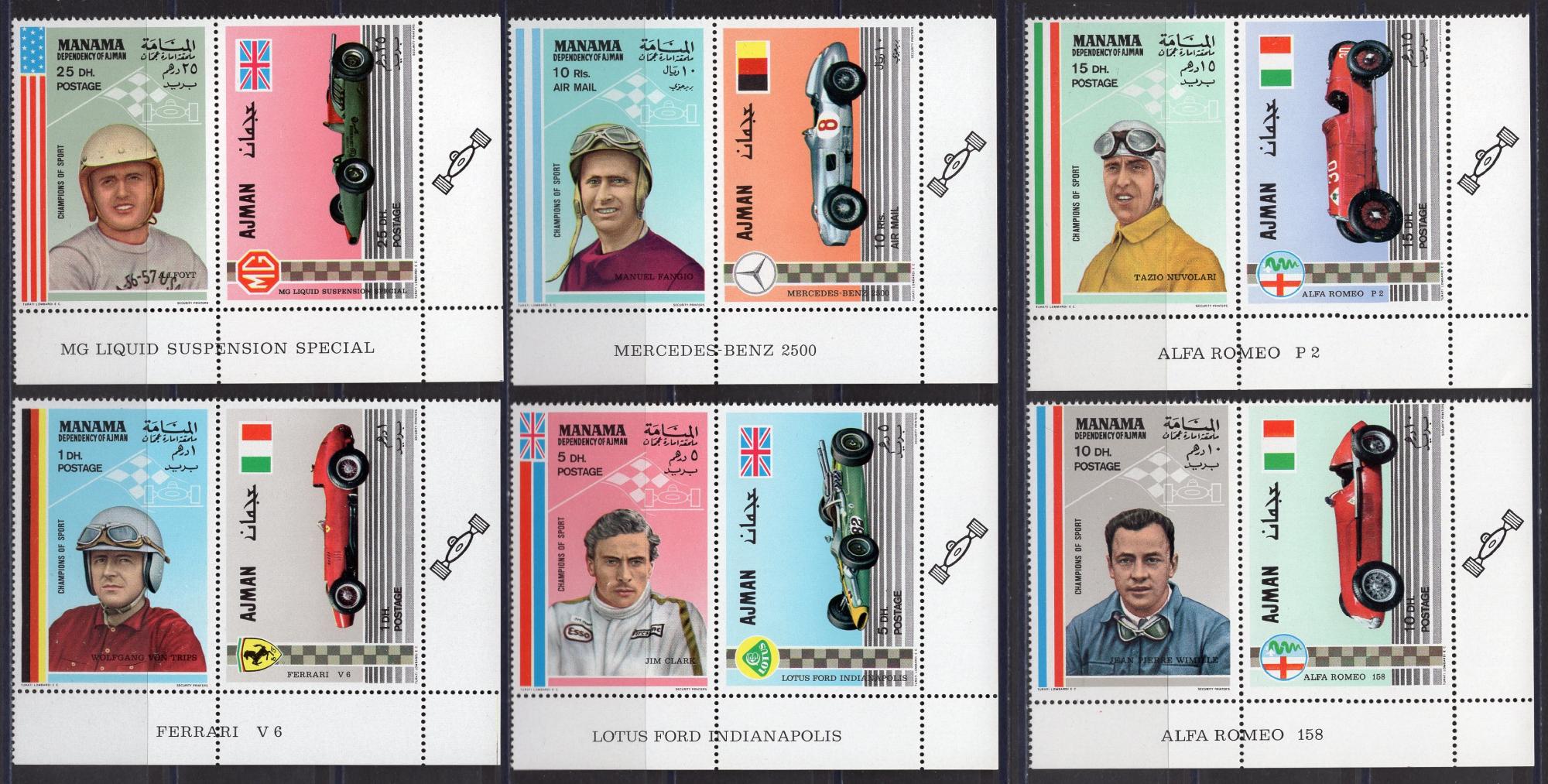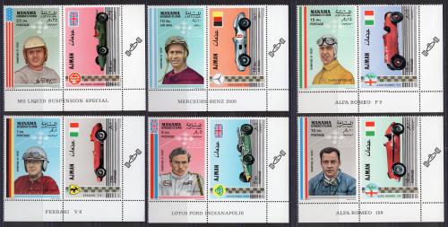 Почтовые марки. Аджман-Манама. 1969г. Гонщики и автомобили. Совместный выпуск. №147-152. №375-380.
