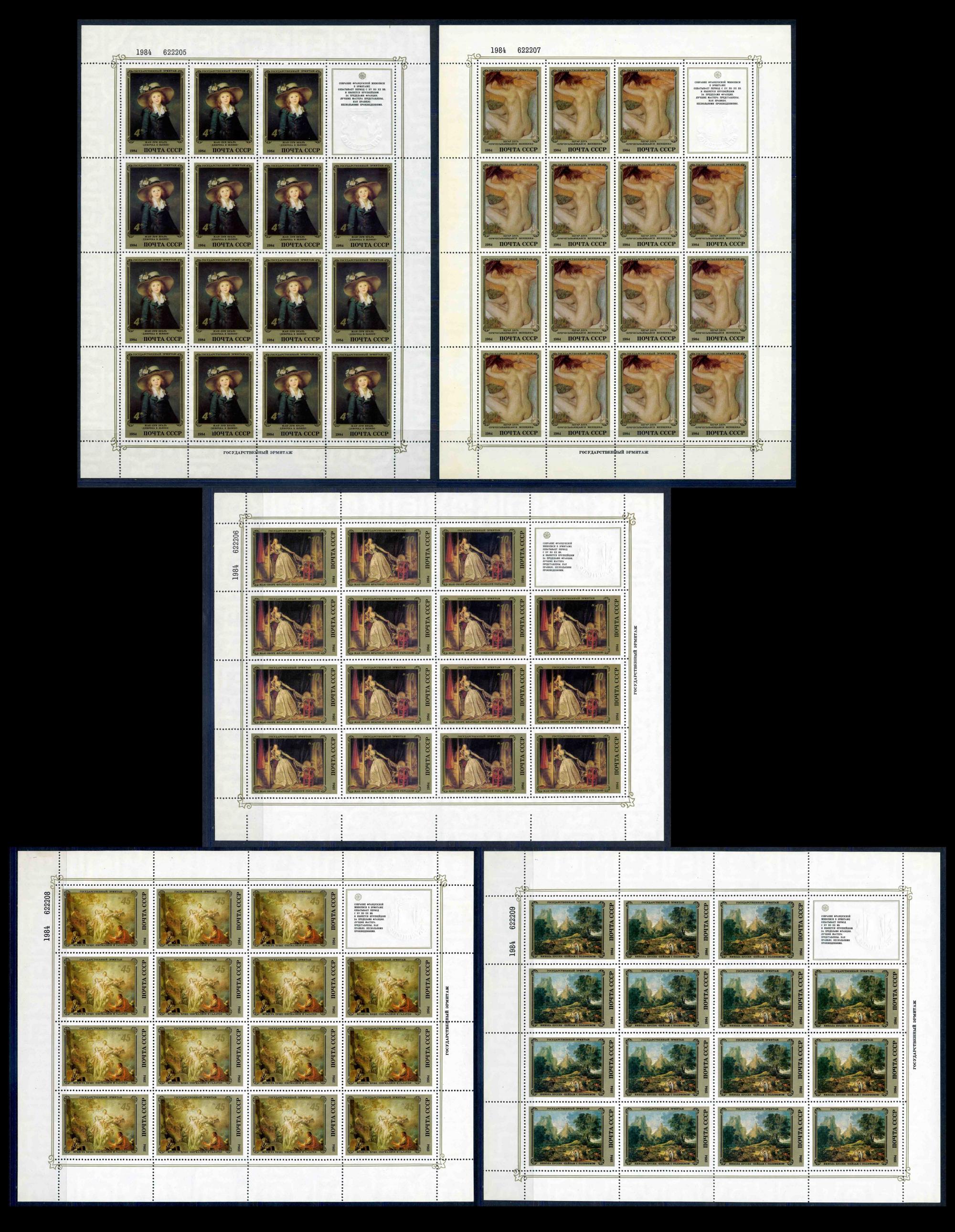 Почтовые марки. СССР 1984 г. Эрмитаж(французская живопись). № 5573-5577. ЛИСТЫ (4*4) с купоном.