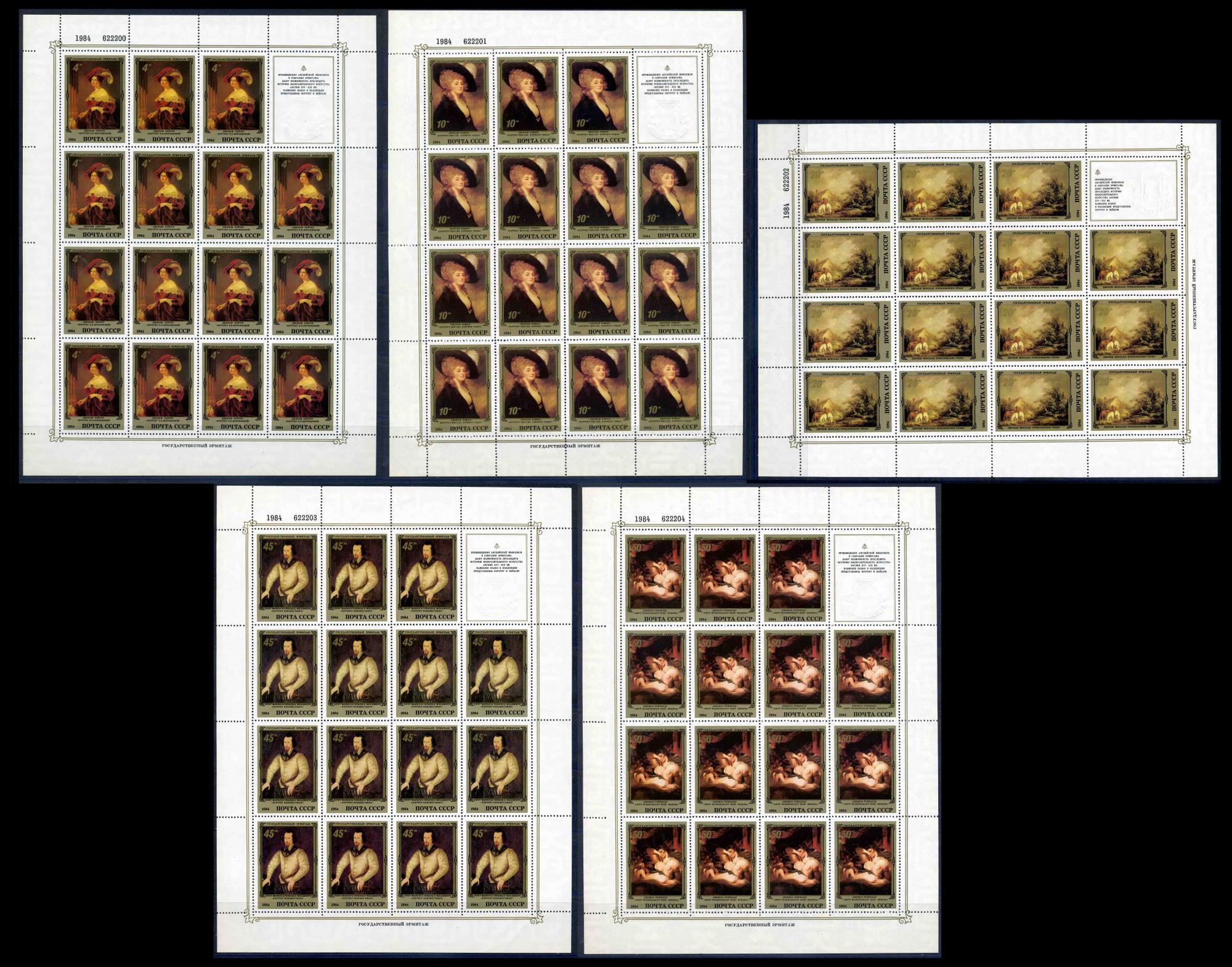 Почтовые марки. СССР 1984 г. Эрмитаж(английская живопись). № 5483-5487. ЛИСТЫ (4*4) с купоном.