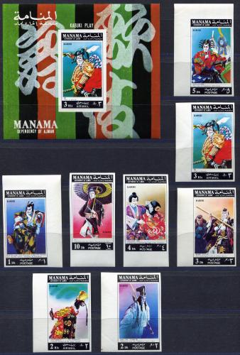 Почтовые марки. Манама. 1971г. Театр Кабуки. №753в-760в. Блок №153в. Беззубц.