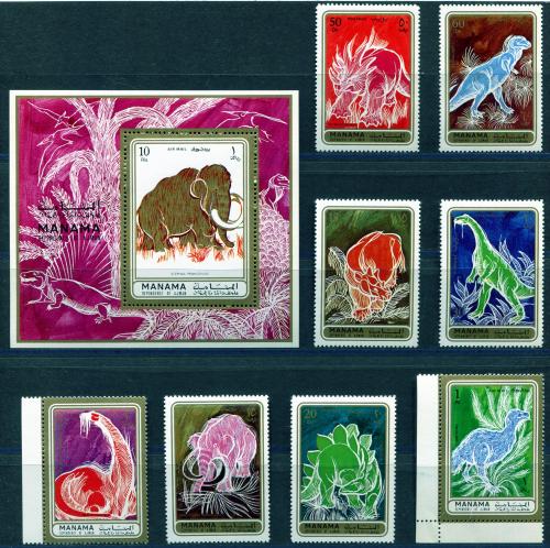 Почтовые марки. Манама. 1971г. Доисторические животные. № 681-688. Блок №135 (Mi: 13.00 Евро)
