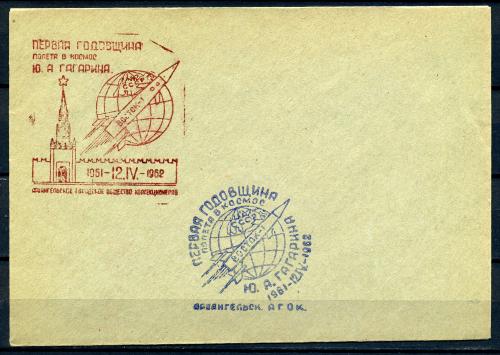 Конверт со СГ. СССР 1962 г. 1-я годовщина полета в космос Ю.А. Гагарина. КО.