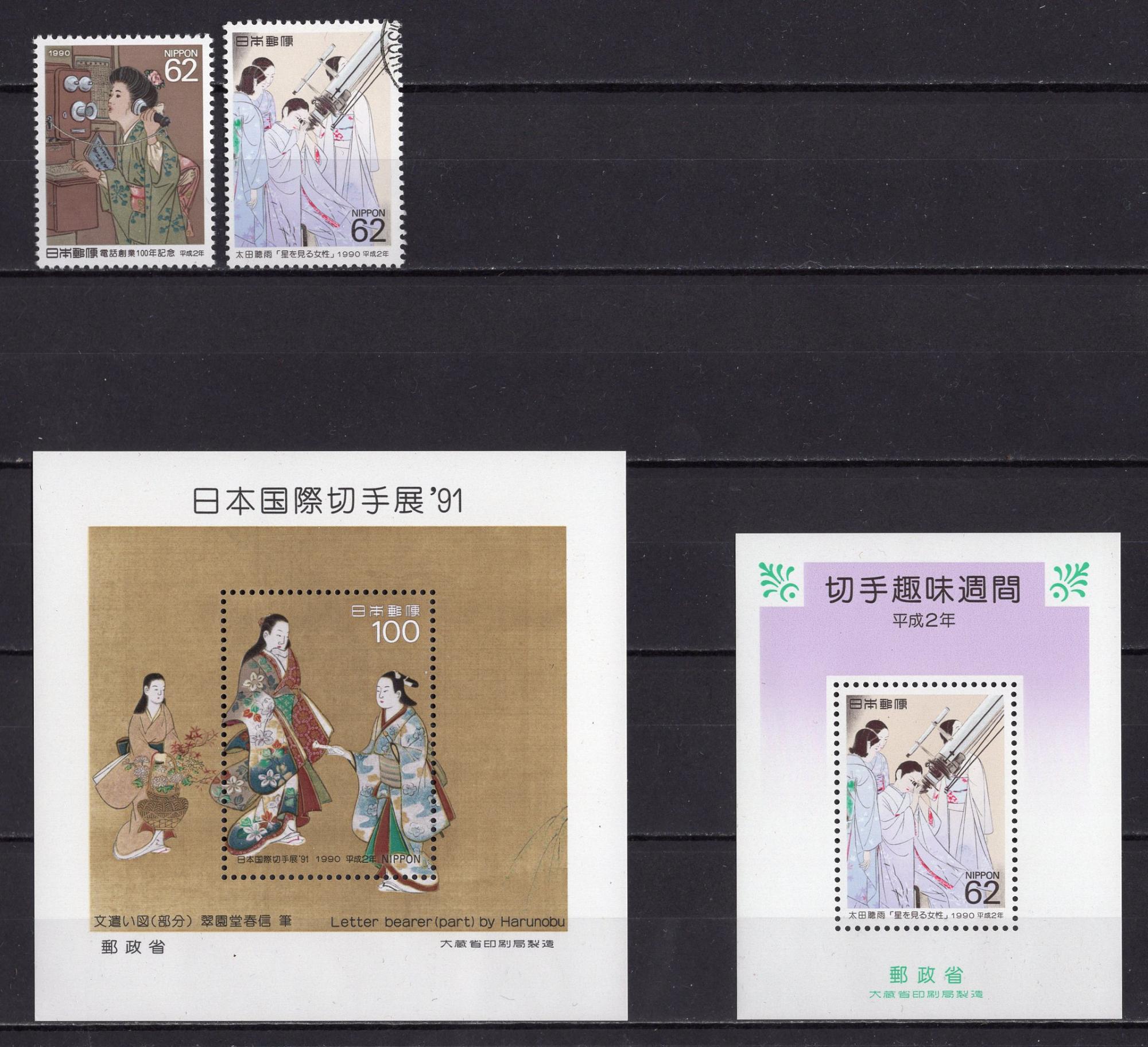 Почтовые марки. Япония, 1990. №1905, 2013. Бл. 145, 147. Телефонная связь. Филателия (выставки).