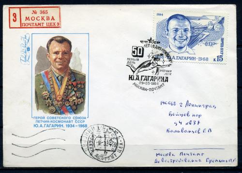 КПД со СГ прошедший почту. СССР 1984 г. 50 лет со ДР Ю.А.Гагарина.