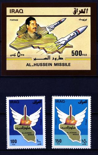 Почтовые марки. Ирак. 1988. Саддам Хуссейн. Ракеты. № 1422-1423 + Бл. 59 (Mi: 16.00 Евро).