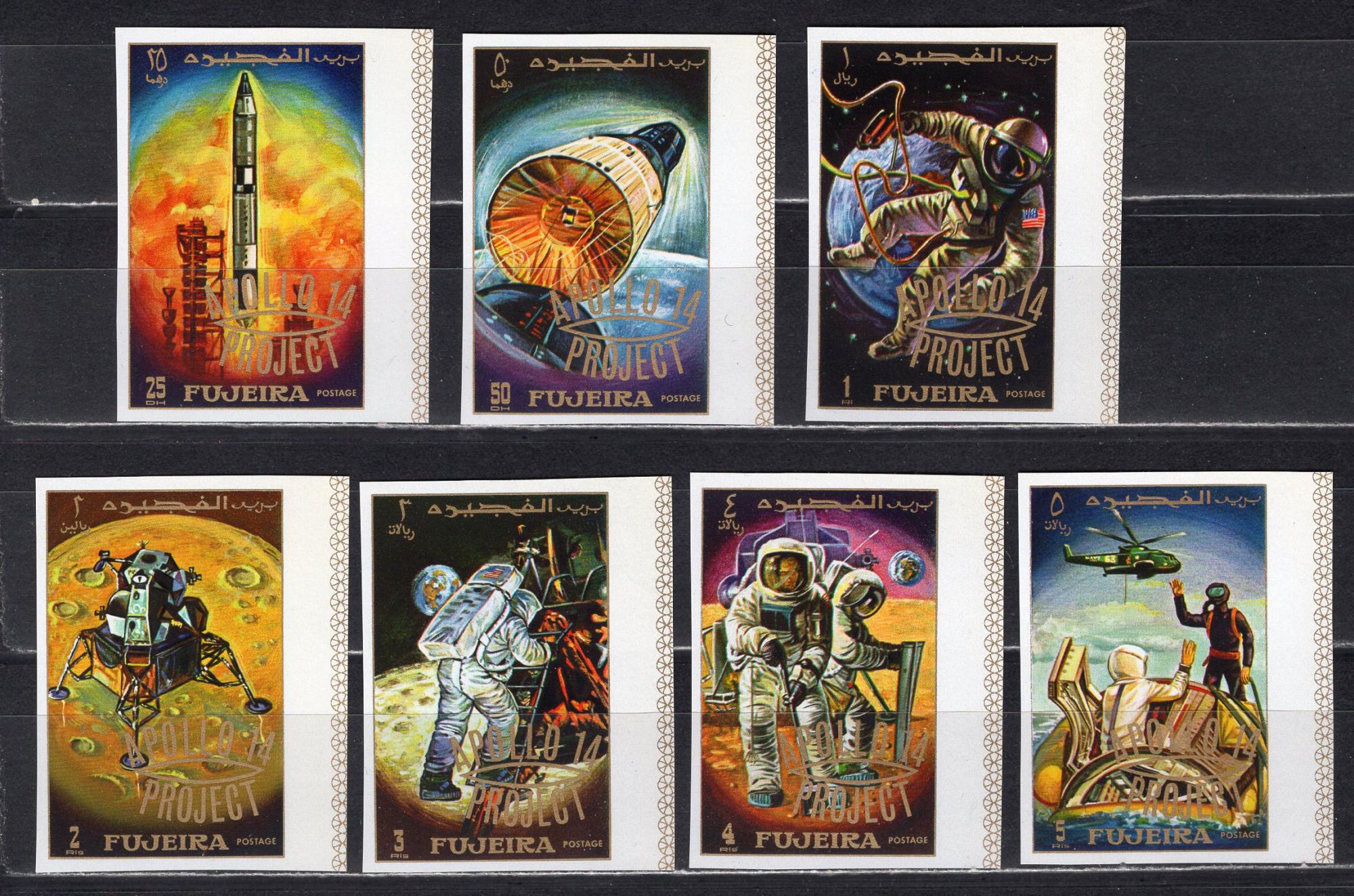 Почтовые марки. Фуджайра. 1970г. Космос. Аполло-14. Надпечатка. №463в-469в. Беззубц.