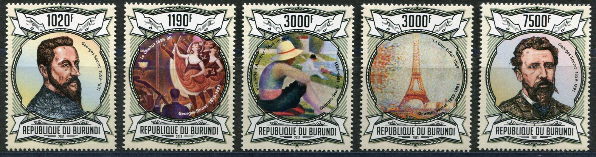 Почтовые марки. Бурунди. 2013. Живопись. Жорж Сёро. № 3058-3062.