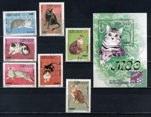 Почтовые марки. Вьетнам. 1990г. Кошки. №2160-2166. Блок №77.