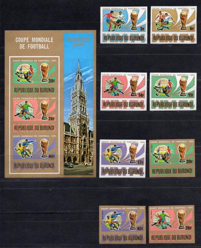 Почтовые марки. Бурунди, 1974 г. Футбол. MiNr. 1058 - 1065, Бл. 78. Комплект. Безз.(Mi 44,00 €)