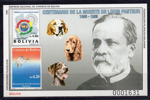 Почтовые марки. Боливия, 1995 г. 100-летие со дня смерти Луи Пастера. Собаки. Бл. 218 (Mi 13,00 €)