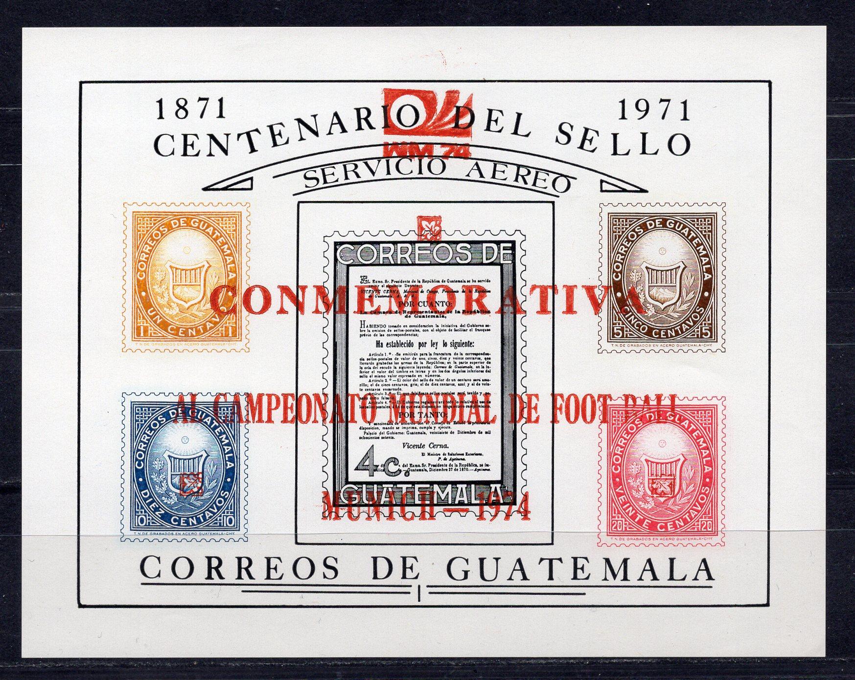 Почтовые марки. Гватемала, 1974 г. Футбол. Бл. 15b. Безз. Надпечатка. Mi 32,00 €