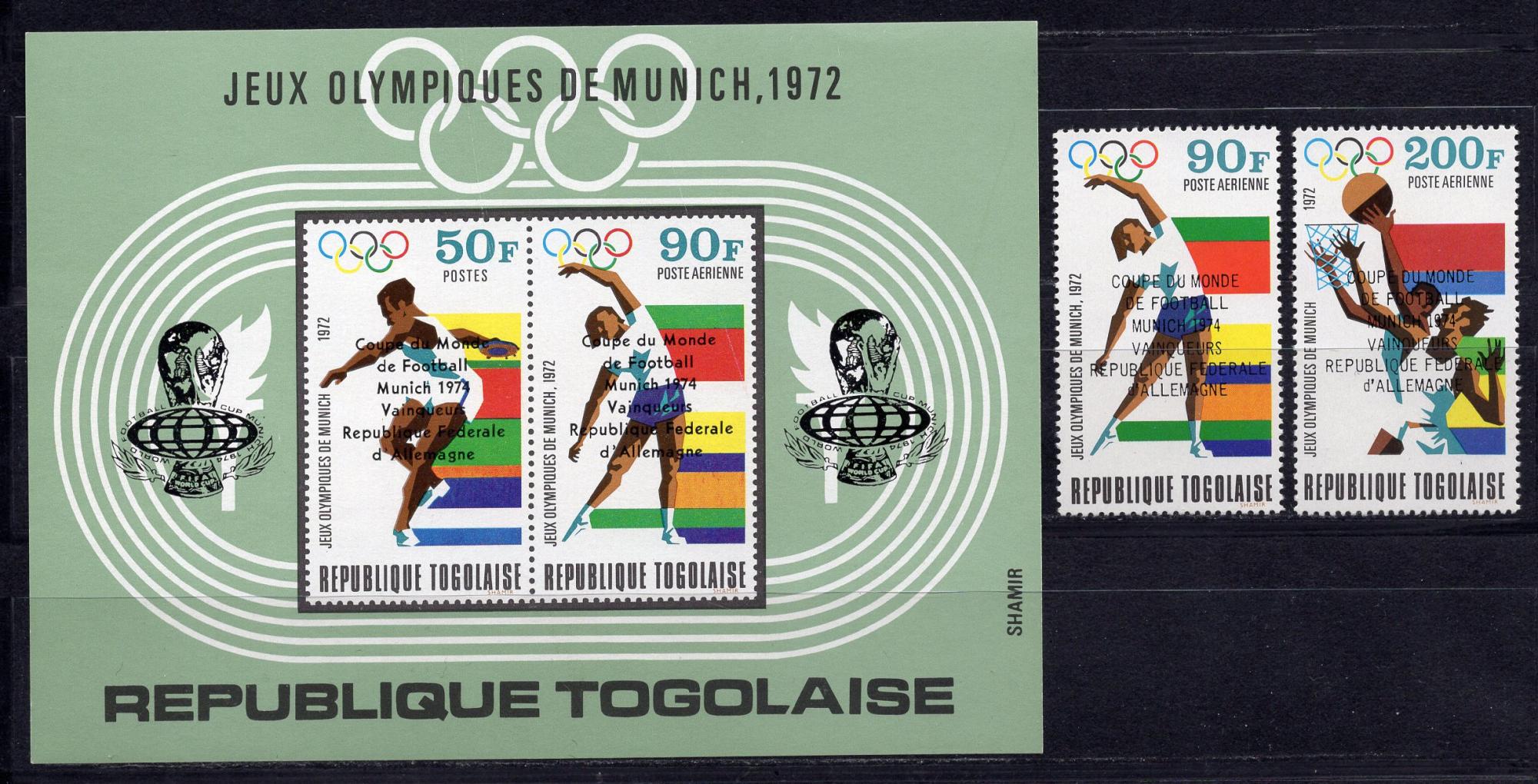 Почтовые марки. Того, 1974 г. №1066-67. Бл. 90. Ол. Игры. Футбол. Надпечатка. Mi 28.0 e