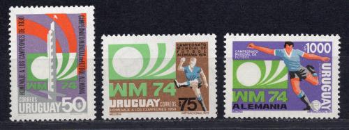 Почтовые марки. Уругвай, 1974 г. №1302-1304. Футбол. Mi 25.0 e