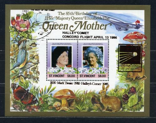 Почтовые марки. Сент-Винсент. 1985г. Королева Елизавета II. Космос. Надпечатка. Блок №21.
