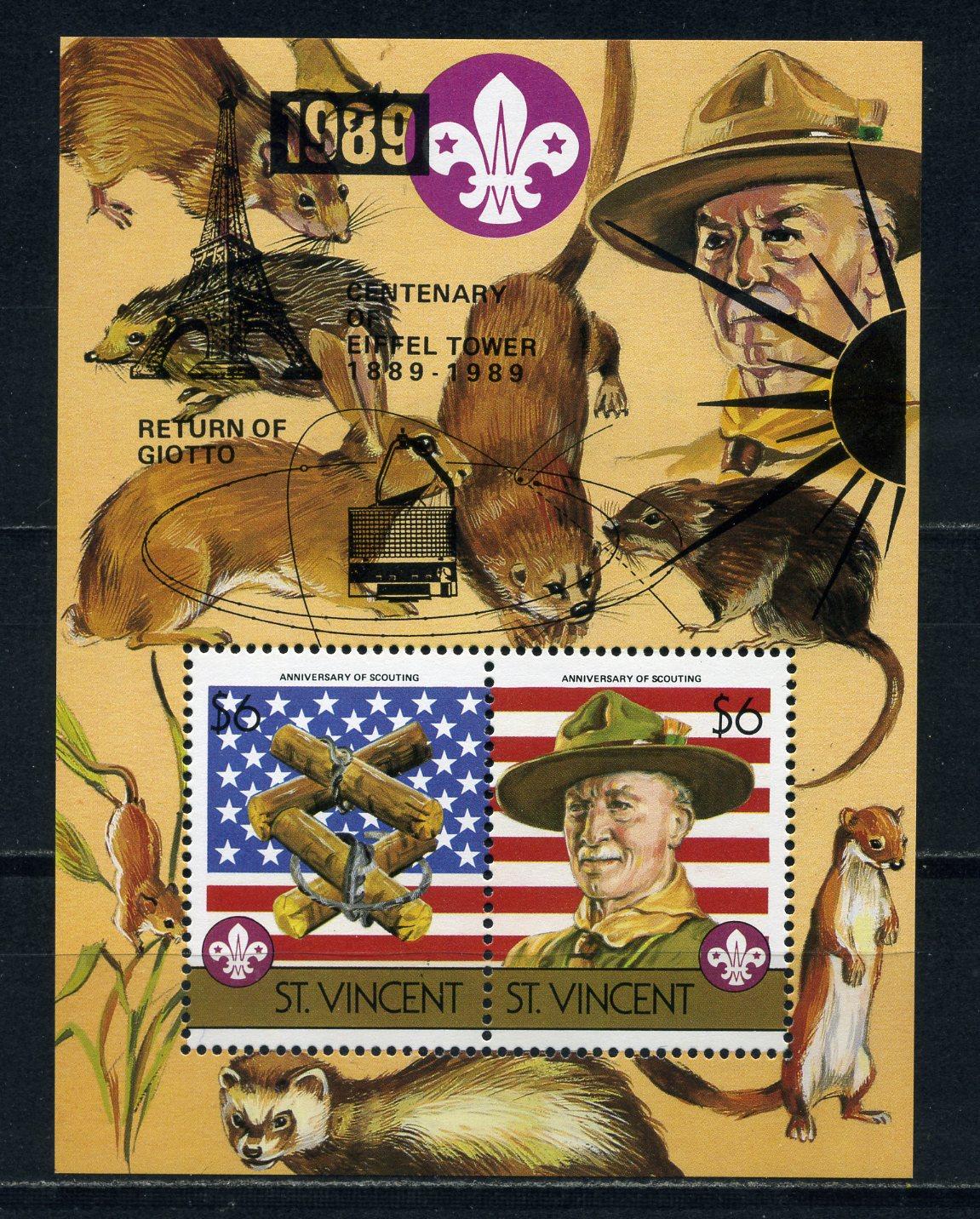 Почтовые марки. Сент-Винсент. 1986г. Бойскауты. Фауна. 100-летие Эйфелевой башни. Надпечатка. BL32.